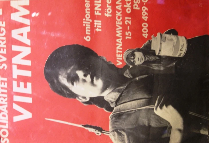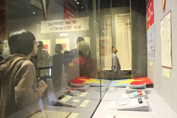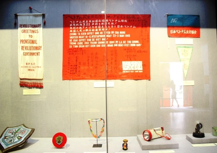 Một số hiện vật có chữ ký ủng hộ Việt Nam, dễ nhận thấy hai màu đặc trưng đỏ xanh của lá cờ Mặt trận dân tộc giải phóng Miền Nam Việt Nam