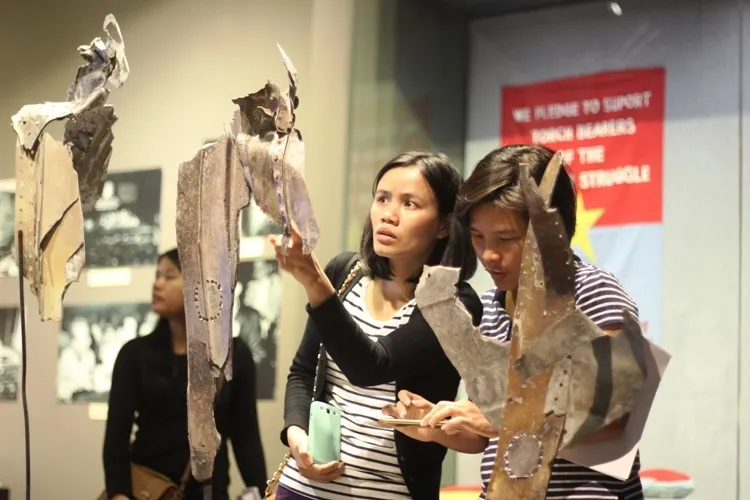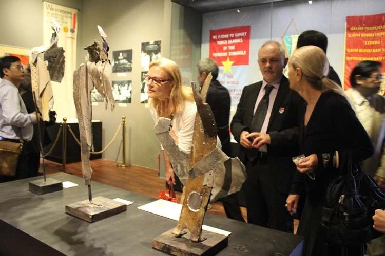 Trưng bày chuyên đề vừa khai mạc vào ngày 24-4 tại Bảo tàng Lịch sử quốc gia. Triển lãm gồm có 150 hình ảnh, tàu liệu hiện vật quý. Trong ảnh là tác phẩm điêu khắc bằng vỏ máy bay của họa sĩ Lê Bá Đảng.