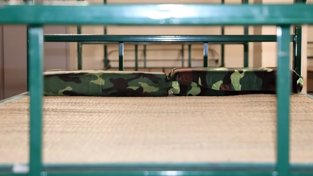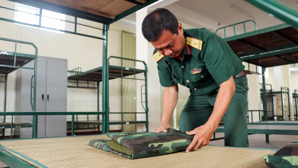 Đại tá Bùi Thanh Cà, Phó Chính ủy Bộ Chỉ huy Quân sự tỉnh Hậu Giang, kiểm tra công tác chuẩn bị khu cách ly tại Trung tâm Huấn luyện dự bị động viên tỉnh. Ảnh: CHÂU ANH