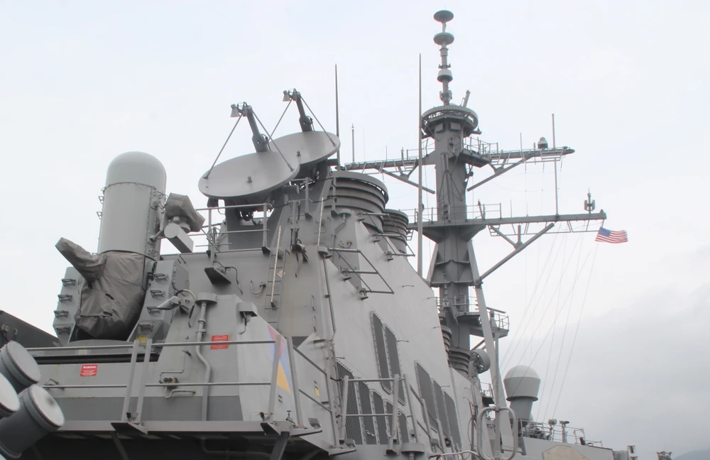 Khu trục hạm này còn được trang bị radar mảng pha 3D AN/SPY, đây là radar thuộc loại tốt nhất hiện nay có thể theo dõi cả trăm mục tiêu cùng một lúc và dẫn dường cho hệ thống vũ khí tiêu diệt 18 mục tiêu cùng một lúc. Ảnh: LÊ PHI.