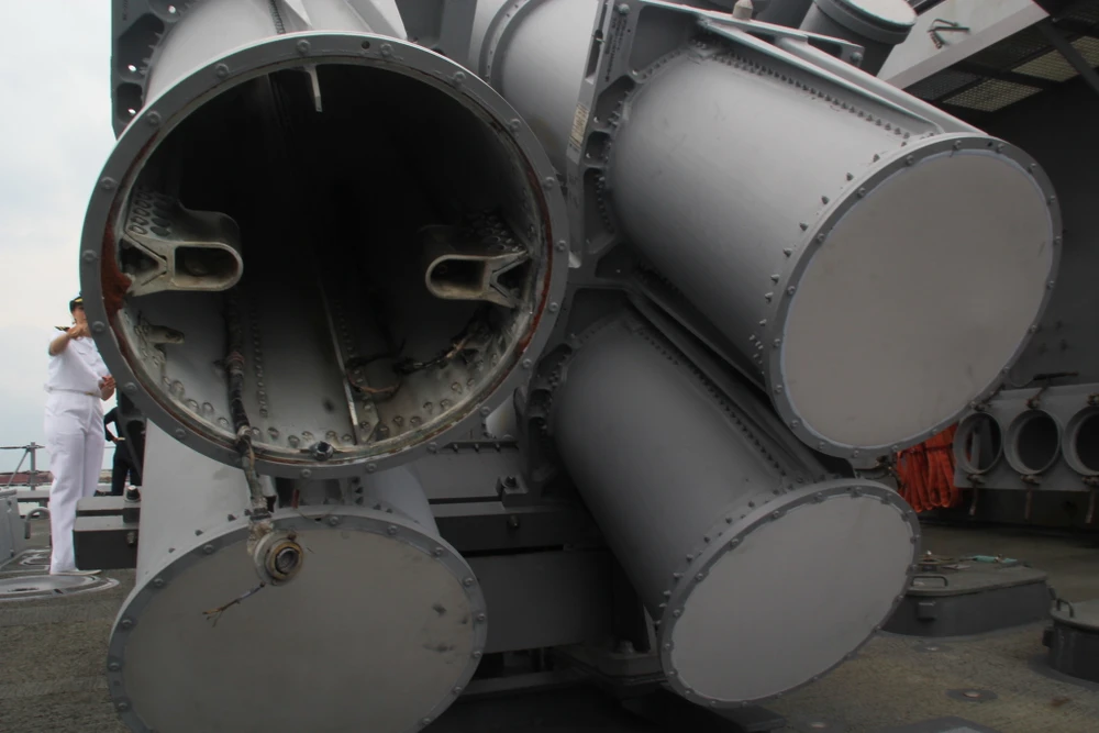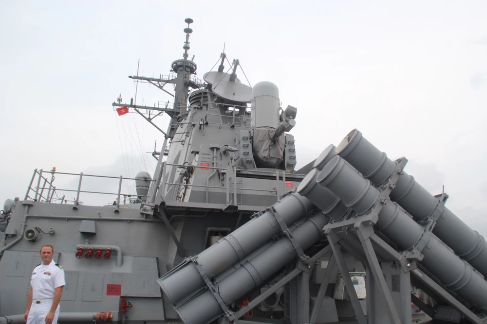 Khu trục hạm này được trang bị hệ thống chiến đấu tiên tiến Aegis (lá chắn tên lửa) có thể triển khai chiến đấu trong mọi điều kiện gồm: tổ hợp tên lửa phòng không RIM-156SM-2, tên lửa hành trình đối đất BGM-109 Tomahawk và tên lửa chống ngầm RUM-139. Ảnh: LÊ PHI.