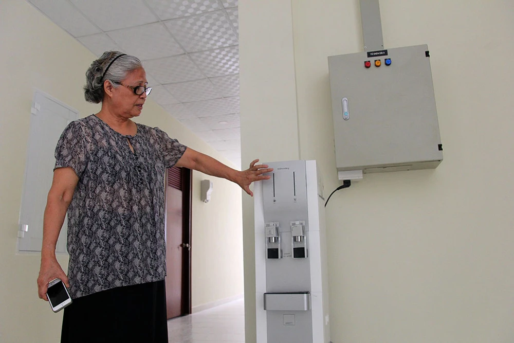 Hành lang của mỗi tầng đều đặt các máy đun nước nóng tự động phục vụ sinh viên