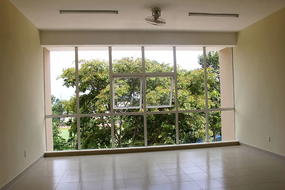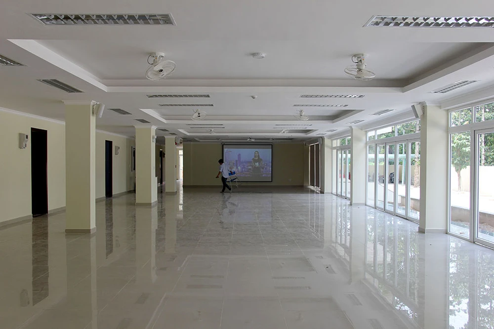 Một phần tầng trệt KTX dùng để tổ chức các hoạt động sinh hoạt chung cho sinh viên với không gian thoáng mát và hệ thống màn chiếu.