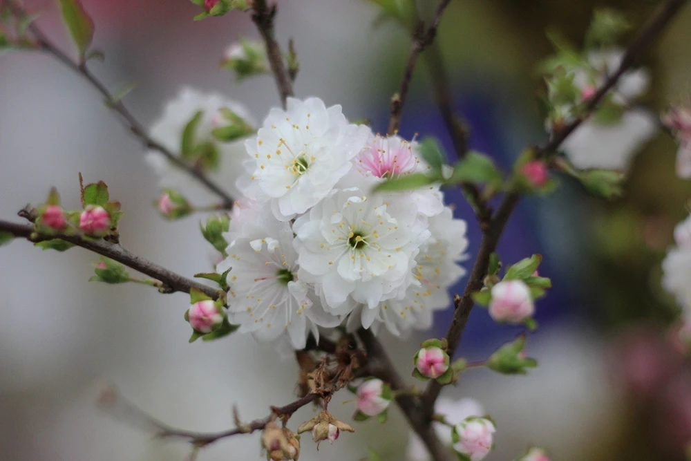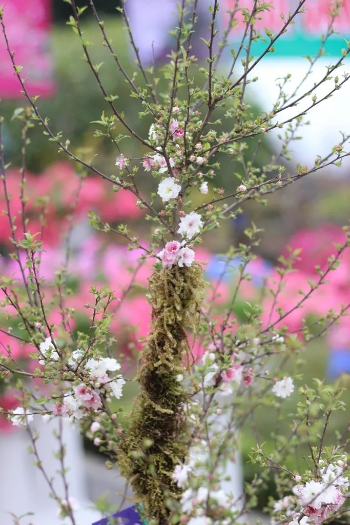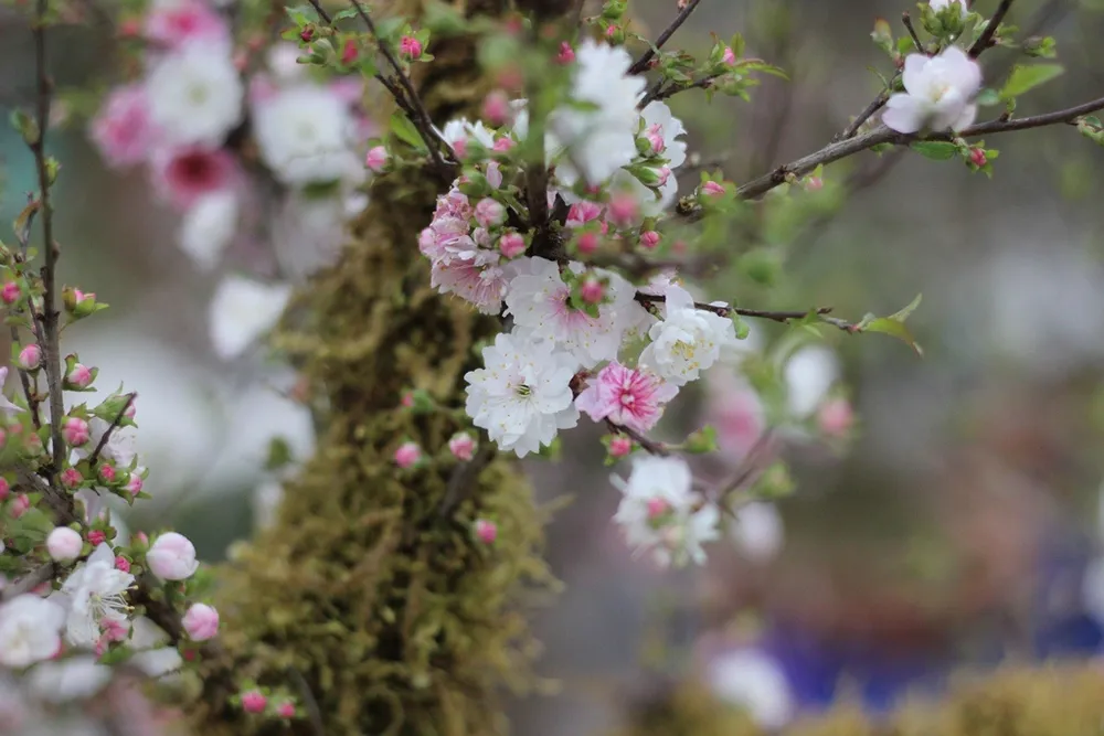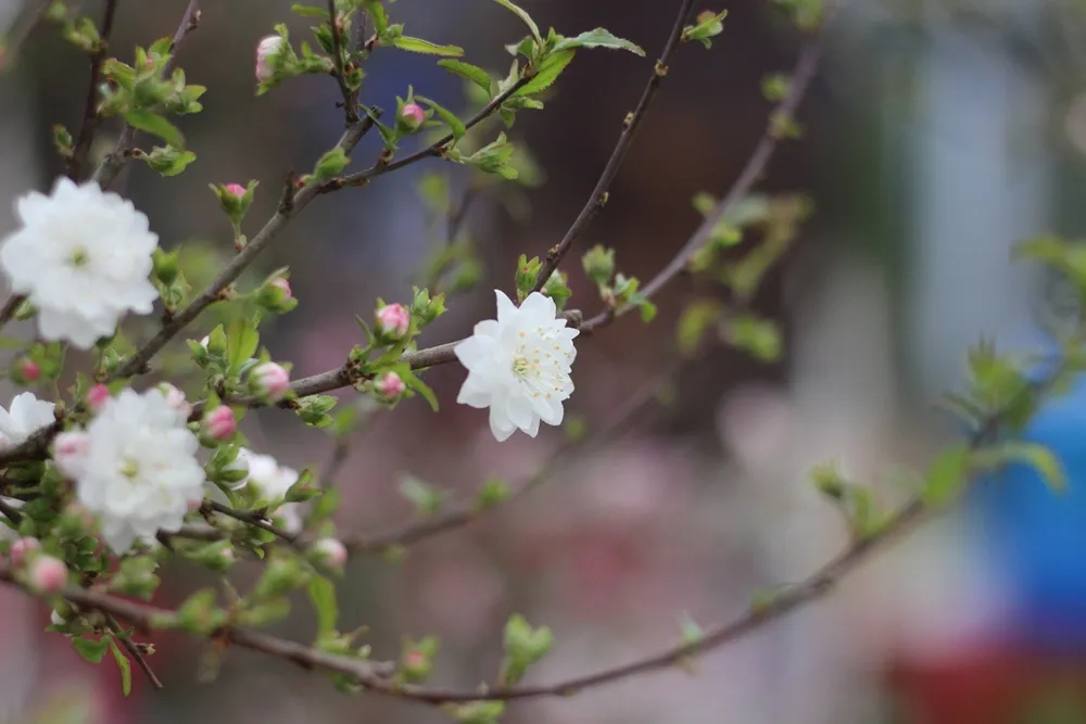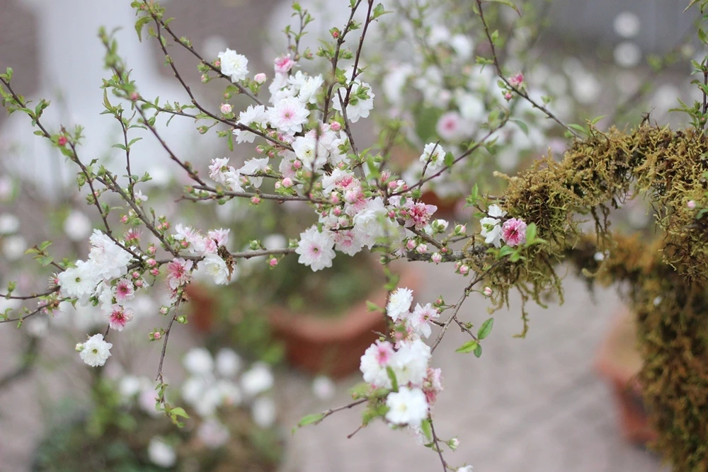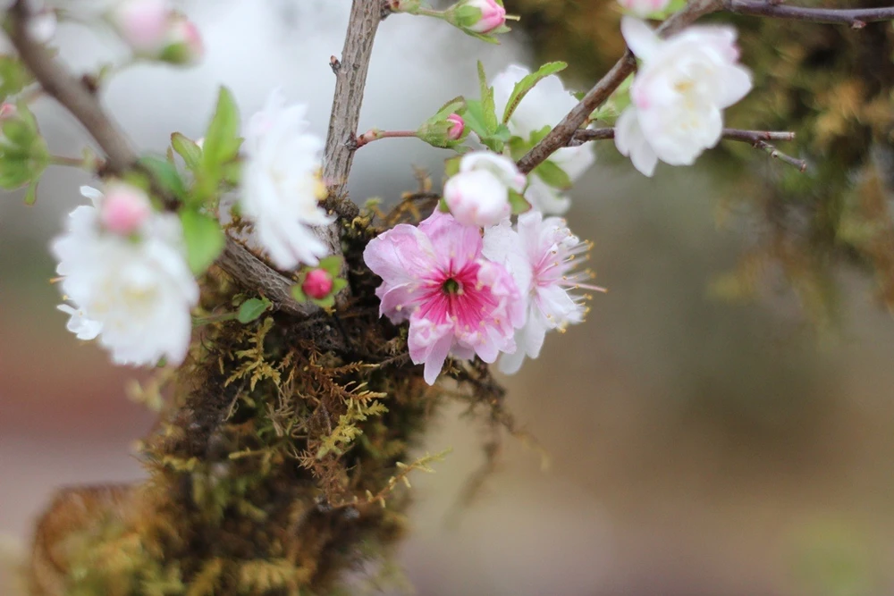 Lộc lá, nụ và hoa đan xen nhau, thể hiện sức sống mạnh mẽ của cây, rất thích hợp với không khí ngày Tết.