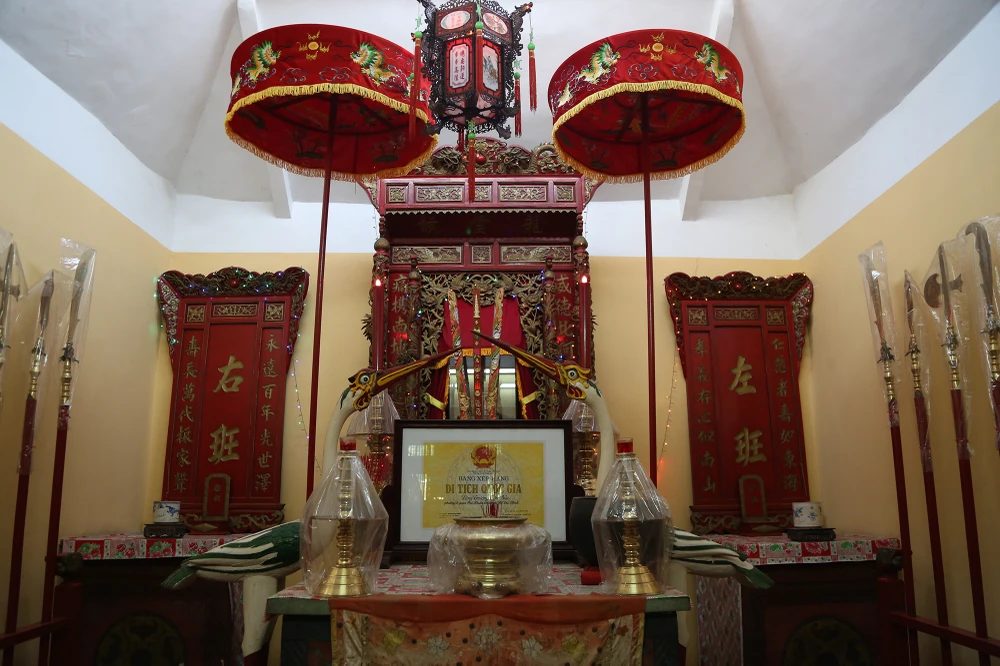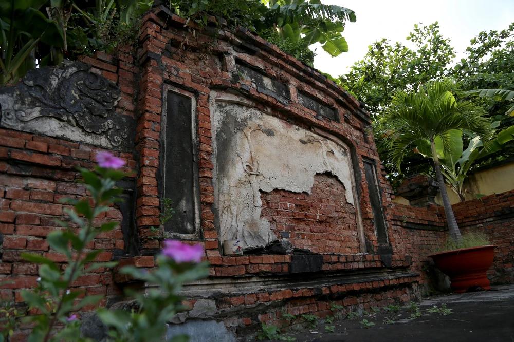 Bình phong hậu bị bong tróc hầu hết, phù điêu tùng hạc chỉ còn vài họa tiết.