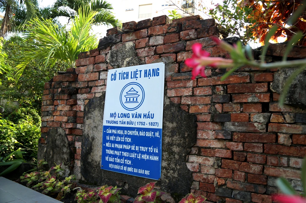 Mặt bằng khu lăng mộ gồm bình phong tiền, cổng ngoài, sân bái đình, cổng trong, hương án, mộ và bình phong hậu. Trong ảnh: Bức bình phong tiền đã xuống cấp, hình con lân được đắp trước đây biến mất, thay vào đó là tấm biển báo: “Cổ tích liệt hạng: Mộ Long Vân hầu Trương Tấn Bửu 1752-1827. Cấm phá hoại, di chuyển, đào quật, vẽ và viết lên di tích. Nếu ai vi phạm sẽ bị truy tố theo luật lệ hiện hành về bảo tồn cổ tích - Viện Khảo cổ, Bộ Quốc gia giáo dục".