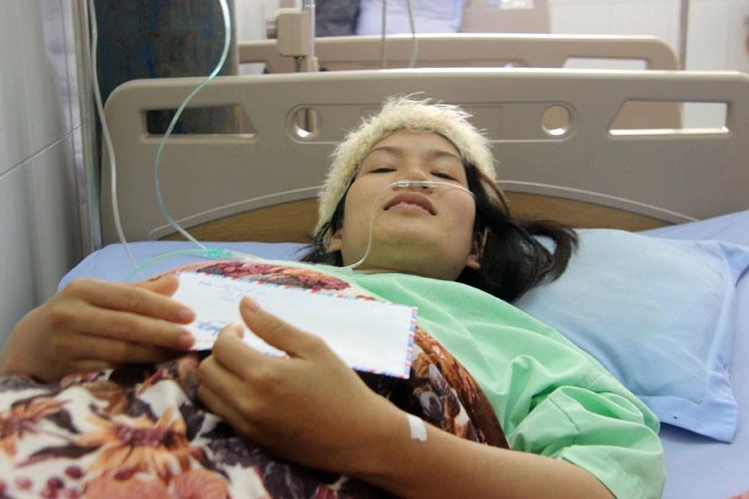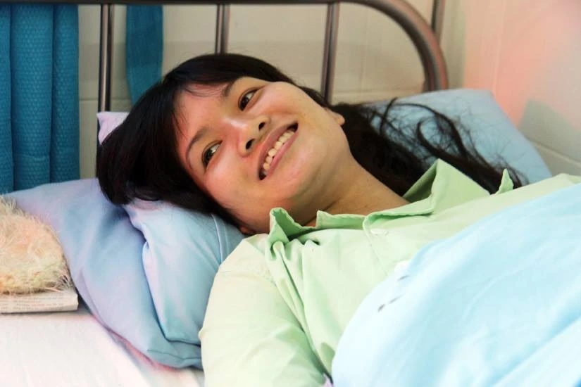Trên giường bệnh, Ngọc thường nở nụ cười hiền và không quên gửi lời cám ơn đến những người đã giúp đỡ chị vượt qua sóng gió.