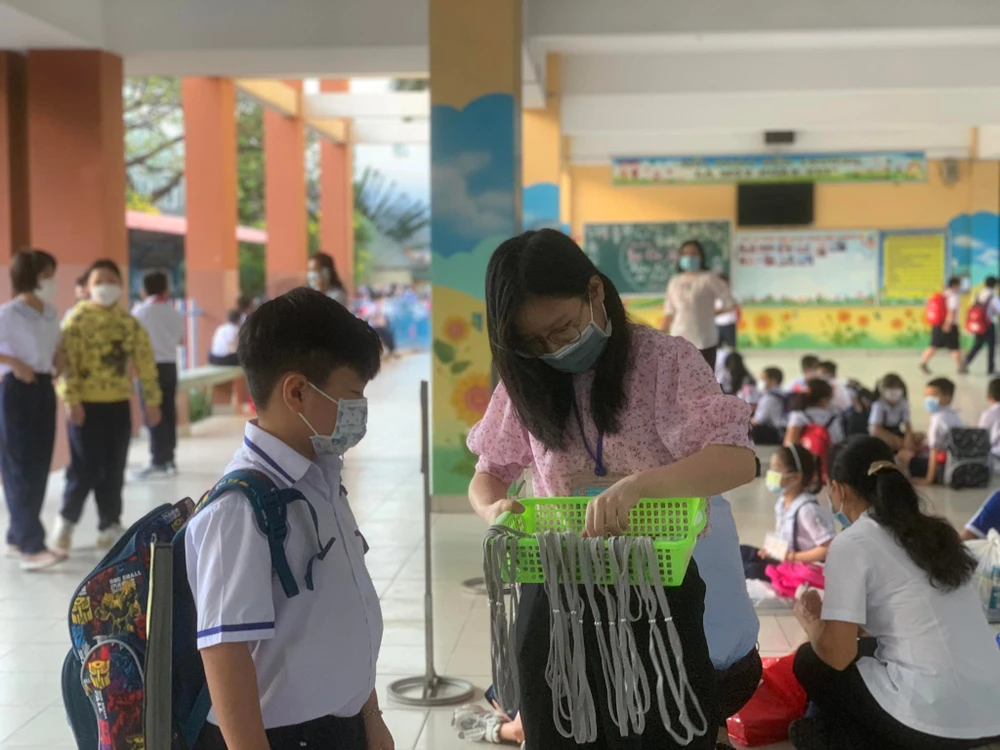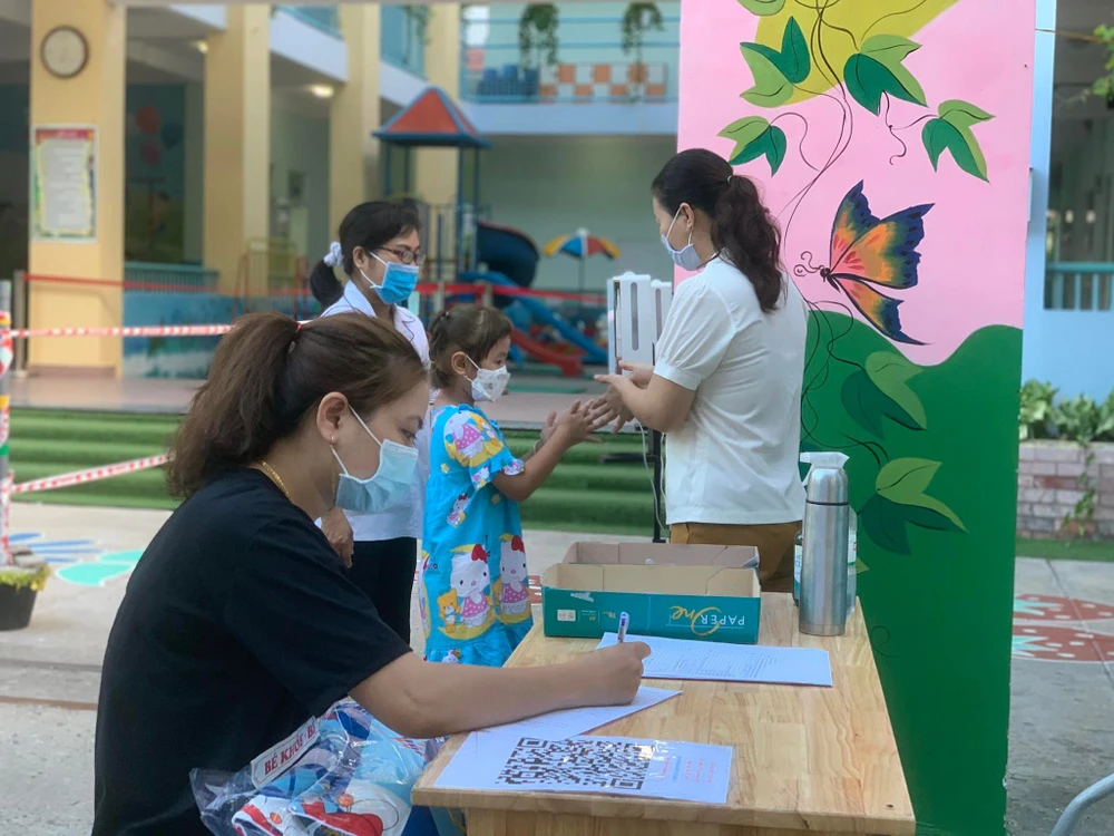 Cô Nguyễn Thị Ngọc Tuyền (phụ trách y tế trường) cho biết trước khi vào lớp các học sinh được thầy cô và bảo vệ hướng dẫn rửa tay sát khuẩn, đo thân nhiệt. Trước đó các phụ huynh đã được nhà trường triển khai khai báo y tế online.