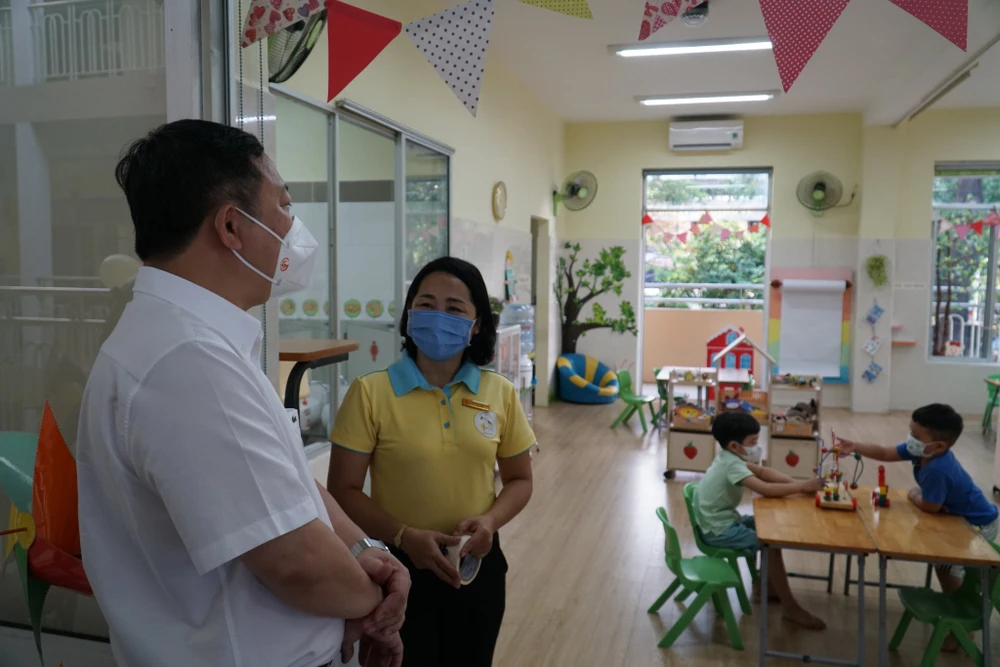 Ông Dương Anh Đức cũng đến kiểm tra tại trường mầm non Bé Ngoan, quận 1. Ảnh: Bảo Phương