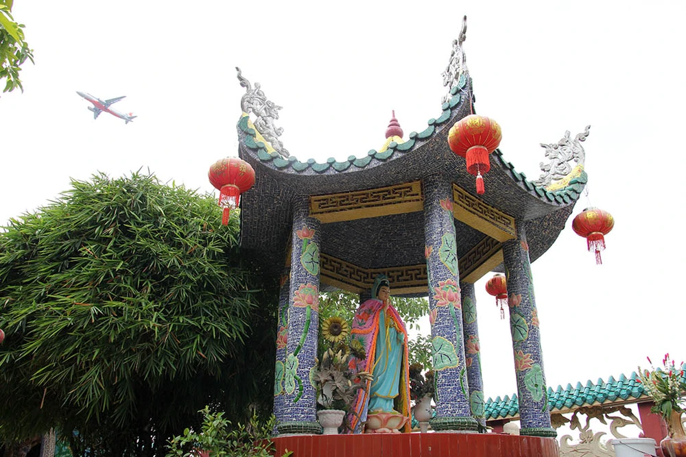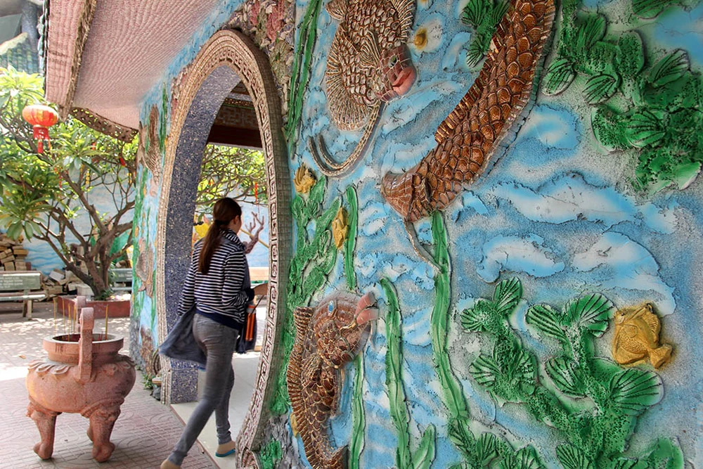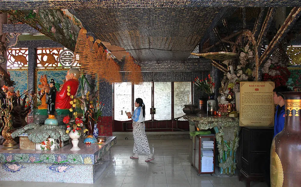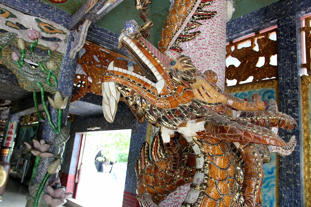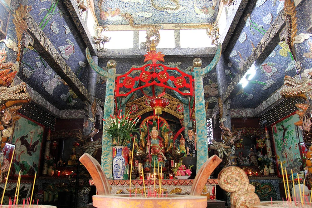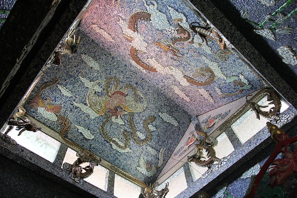 Toàn bộ kiến trúc trong miếu được trang trí tinh xảo, đắp nổi hình rồng, phượng và cẩn sứ, các mái vòm cũng được cẩn sứ và ghép hình tỉ mỉ.