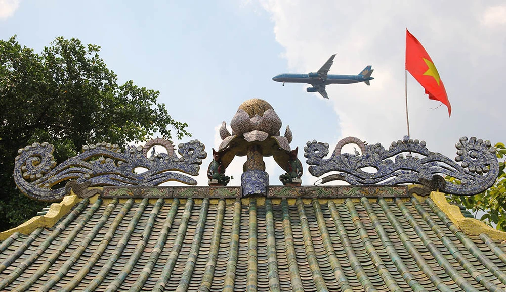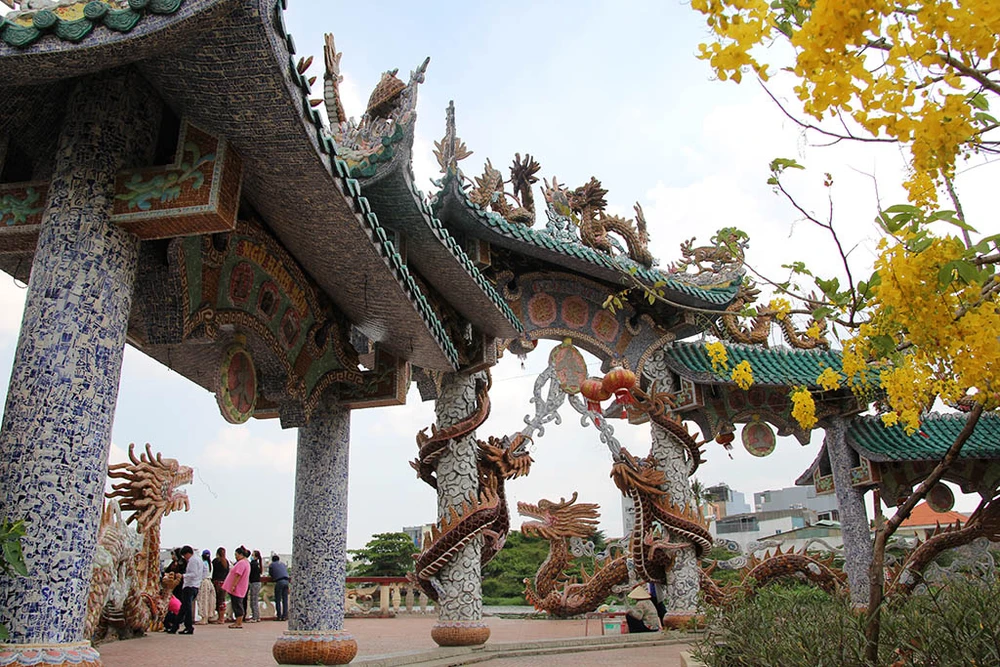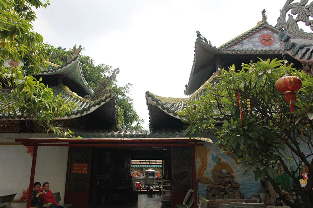 Phần mái của miếu cũng chạm trổ tinh xảo với hàng trăm ngàn mảnh sứ tạo hình rồng, chim, mây núi...