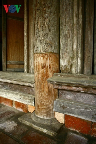 Một cây cột được thay thế phần chân. Chân cột được đỡ bởi đế bằng đá xanh. Các phần thay mới đều được đánh dấu ghi rõ thời gian trùng tu.