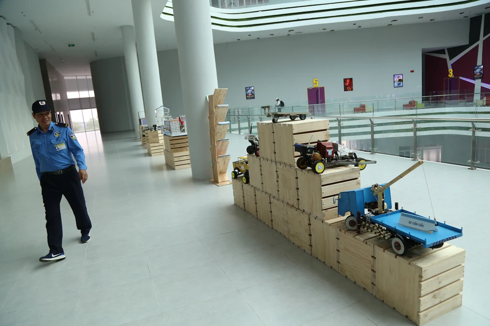 Trưng bày mô hình của sinh viên các trường đại học bên hành lang tầng bốn của nhà văn hóa.