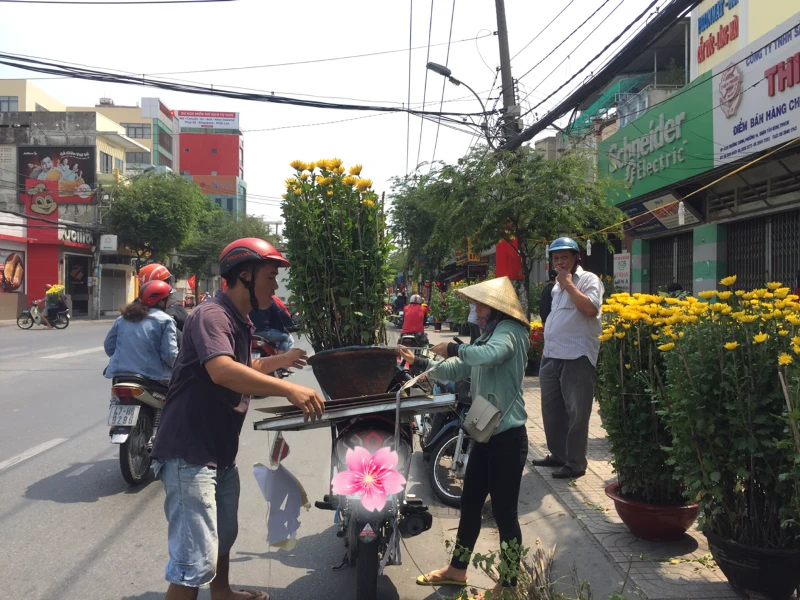 Một cặp hoa cúc có giá 500.000 đồng đang được khách hàng mua và thuê xe chở về.