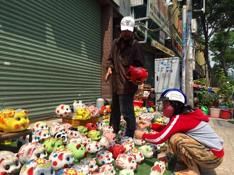 Biểu tượng năm Kỷ Hợi những ống heo nhiều kích cỡ được làm bằng men trang trí với nhiều màu sắc rực rỡ thu hút khách hàng tìm mua ngày 30 Tết.