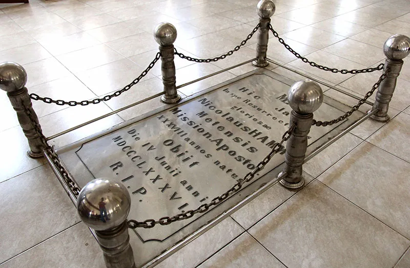 Thi hài của cha Hamm được mai táng trong nền thánh đường, ngay trước bàn thờ Đức Mẹ. Ảnh: HOÀNG GIANG