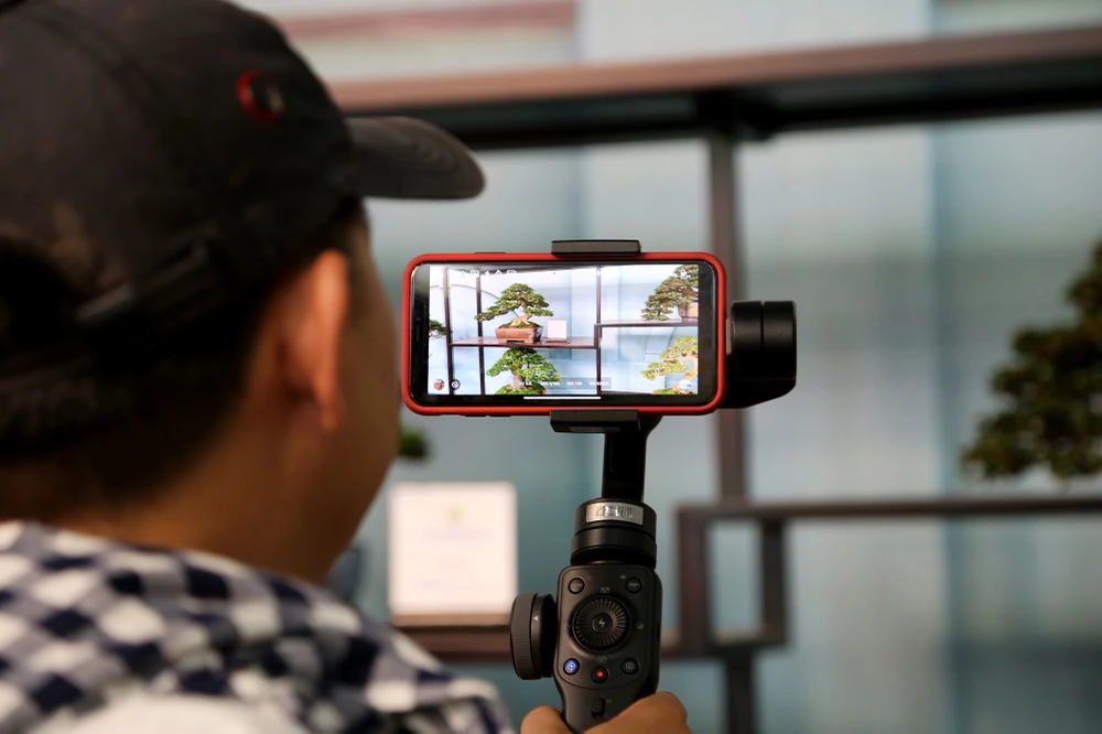 Người dân và du khách ghi lại những tác phẩm bonsai được trưng bày.