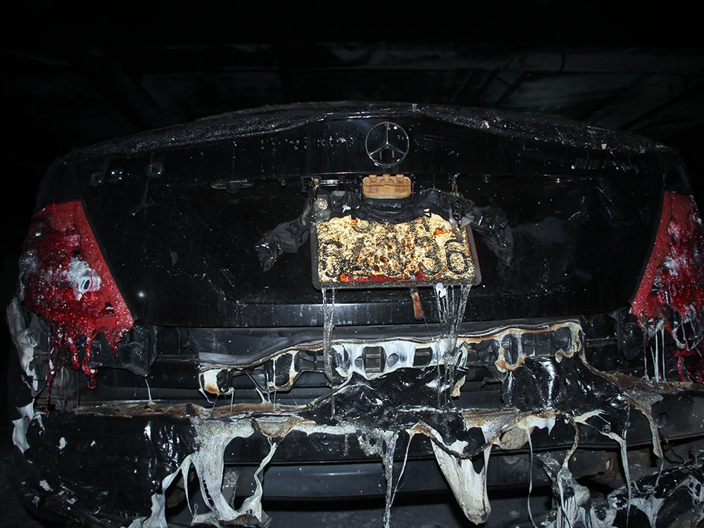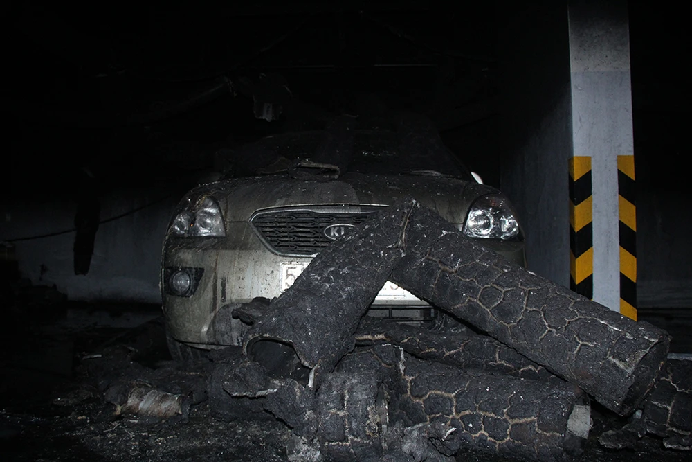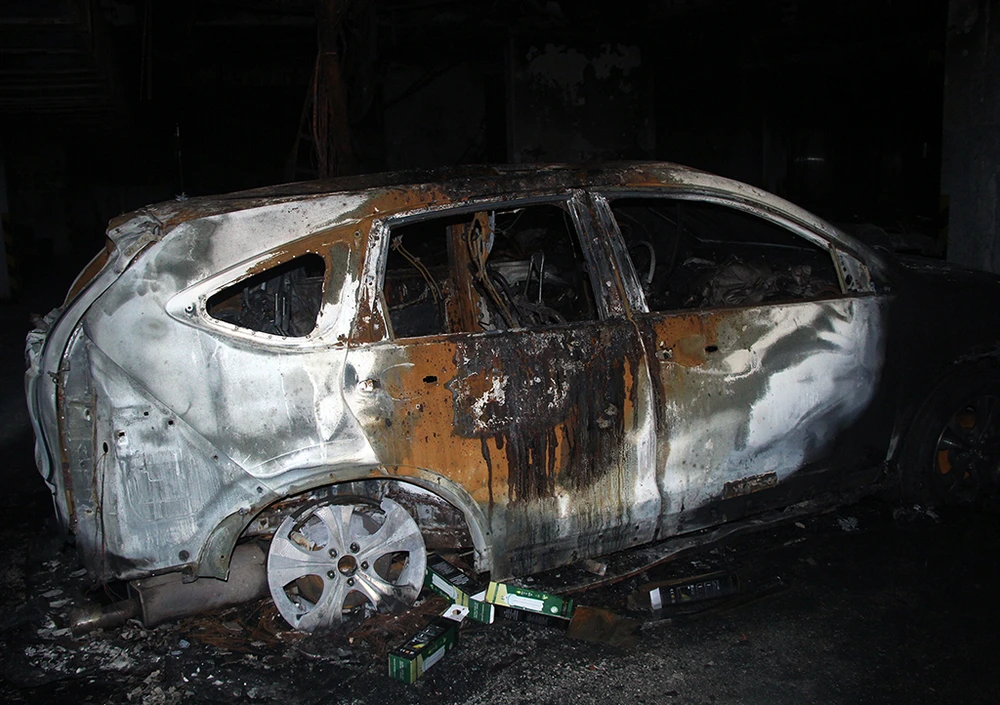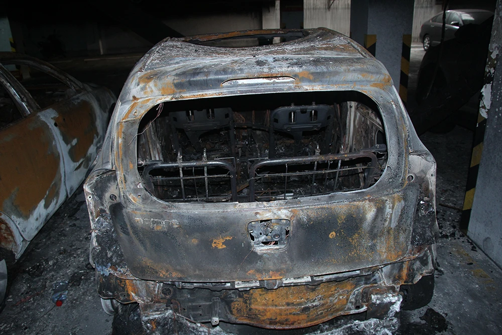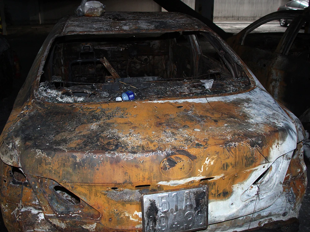 Chiếc ô tô cháy chỉ còn trơ khung sắt. Phải mất một thời gian khá lâu những phương tiện này mới được di chuyển khỏi tầng hầm để xe.