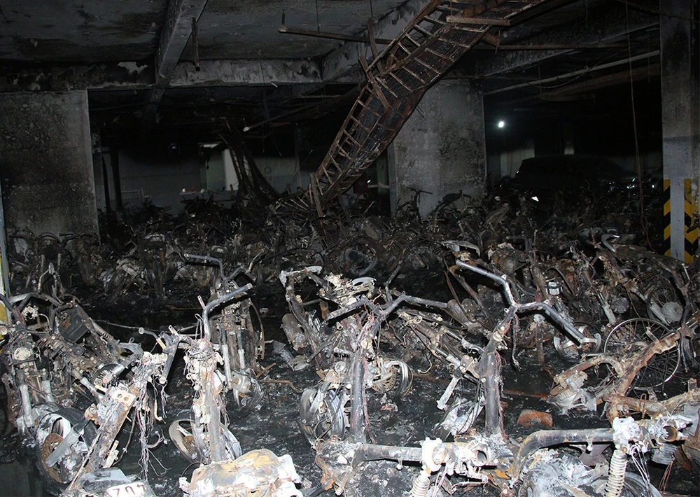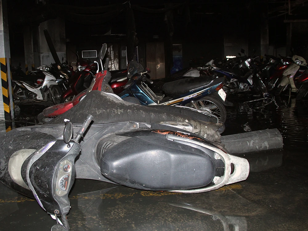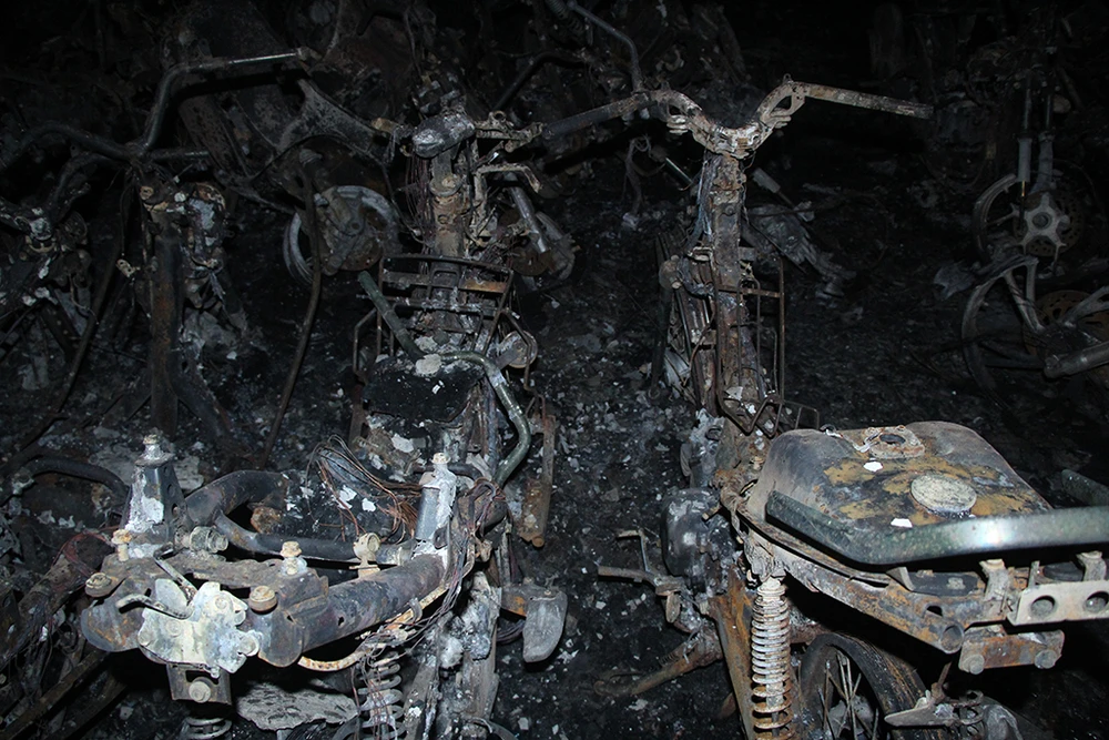 Những chiếc xe máy cháy trơ khung nằm la liệt khắp tầng hầm tạo nên một khung cảnh hoang tàn.