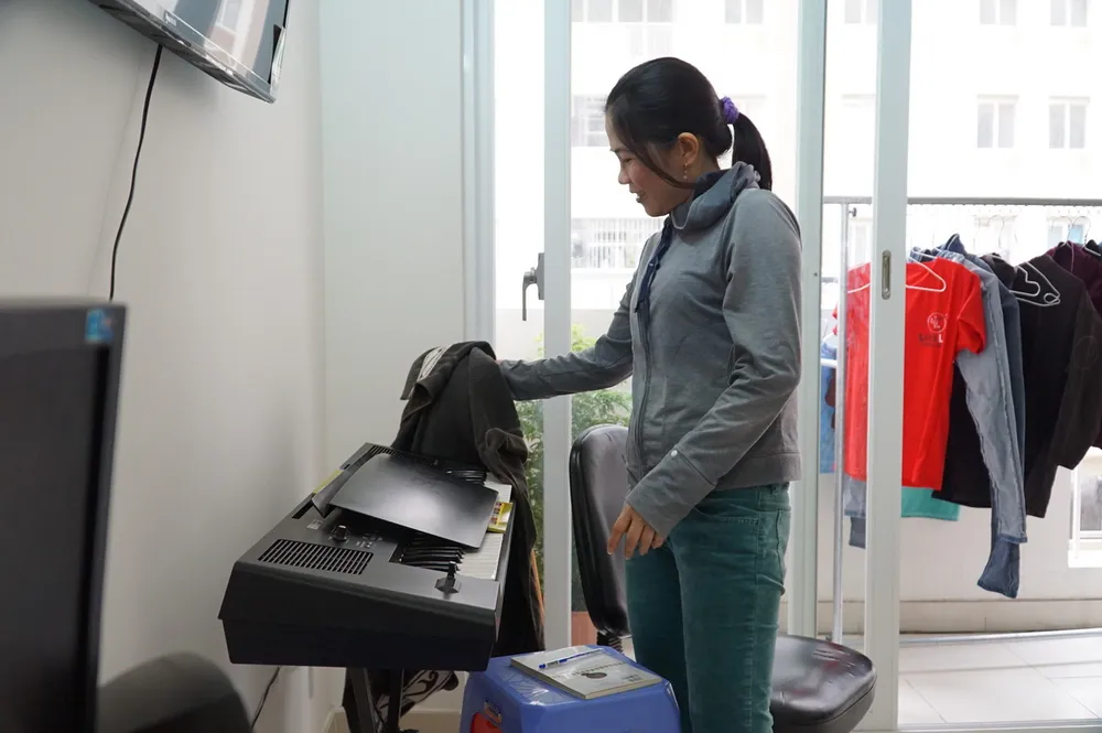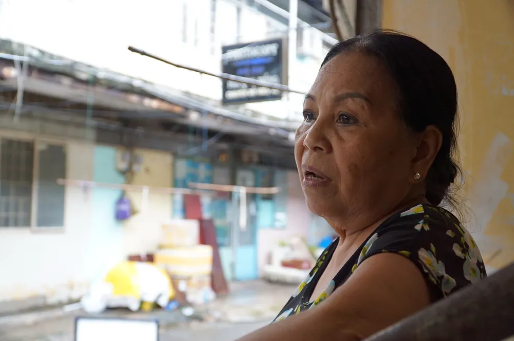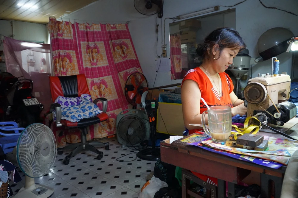 Bà Lê Mỹ Phượng tạm cư trong căn hộ chật chội nhưng đồng thời cũng là tiệm may quần áo mưu sinh của cả gia đình. Bà Phượng lo sẽ vắng khách khi lên chung cư tạm cư. Ảnh: VH