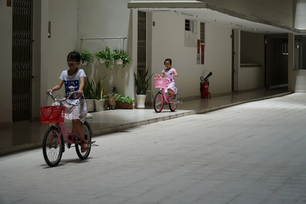 Trẻ em vui đạp xe trong khuôn viên chung cư. Theo UBND quận 2, trong số 44/83 hộ đã đồng ý dọn lên, hiện mới có 22 hộ đã lên ở, còn 22 hộ đã có chìa khóa phòng, đang sắp xếp thời gian để di dời. Quận 2 sẽ hỗ trợ hộ gia đình nào không có người di dời đồ đạc về nơi ở mới. Ảnh: VH
