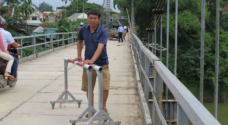 Chiếc cầu treo bắc qua sông Giăng có biển báo "Cầu rất yếu".