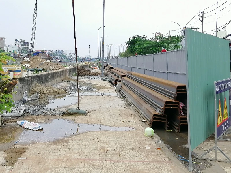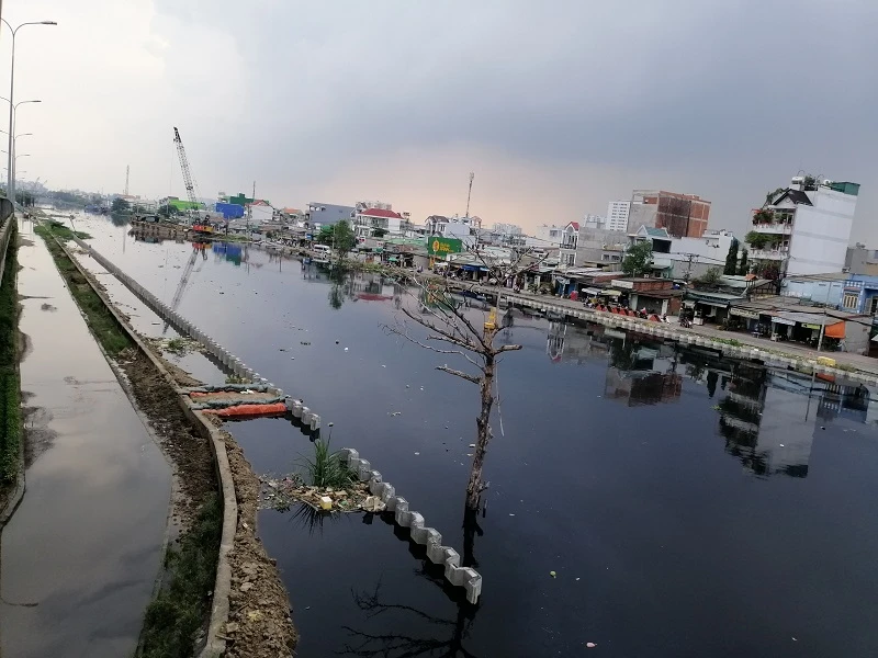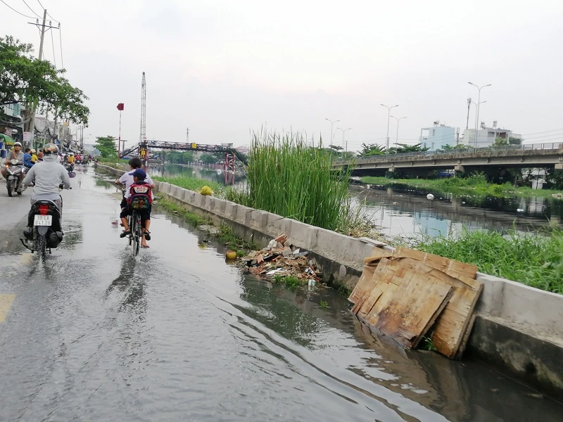 Ghi nhận của PV tại đường Mễ Cốc (phường 15, quận 8) và Bến Phú Định (phường 16, quận 8), xung quanh kênh Lò Gốm đã được xây dựng hàng rào chắn cao 30 cm. Thời điểm này, người dân quận 8 đang đối mặt với đợt triều cường được dự báo là sẽ rất... lênh láng.