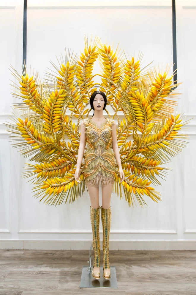 Điểm đặc biệt của bộ trang phục này đó chính là hình ảnh cây lúa nước được thiết kế cách điệu, tỉ mẩn bằng nhiều chất liệu khác nhau và được thực hiện hoàn toàn bằng thủ công; các cây lúa được xếp theo cấu trúc hoa sen – quốc hoa của Việt Nam, thể hiện cấu trúc tâm thế vững chãi, tao nhã và sang trọng.