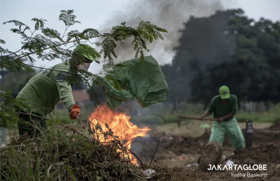 Nhân viên phục vụ tang lễ đốt đồ bảo hộ sau khi hoàn tất nghi lễ an táng. Ảnh: JAKARTAGLOBE
