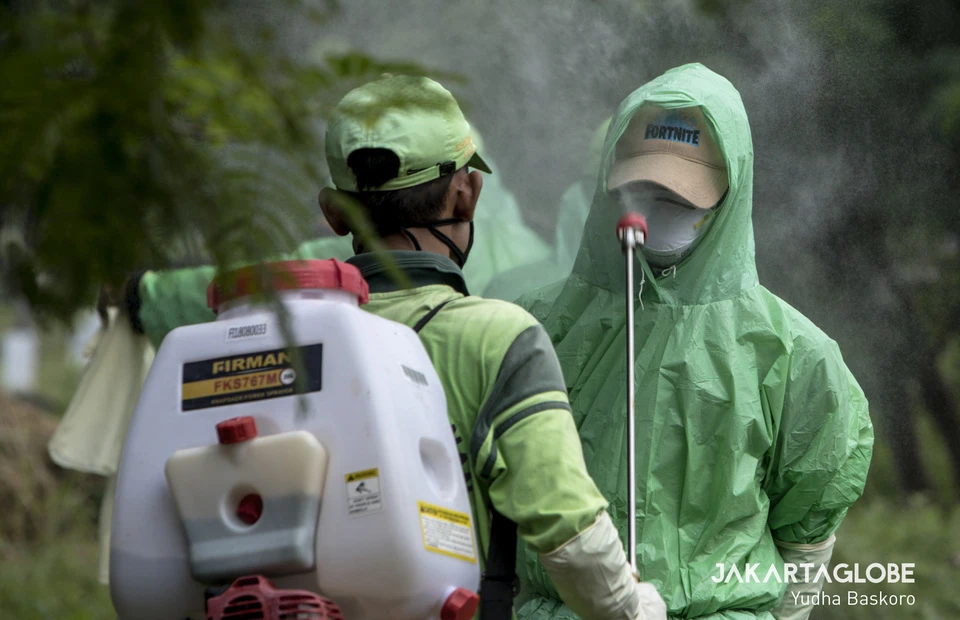 Một nhân viên phục vụ tang lễ được phun thuốc khử trùng sau khi chôn cất thi thể xong. Ảnh: JAKARTAGLOBE