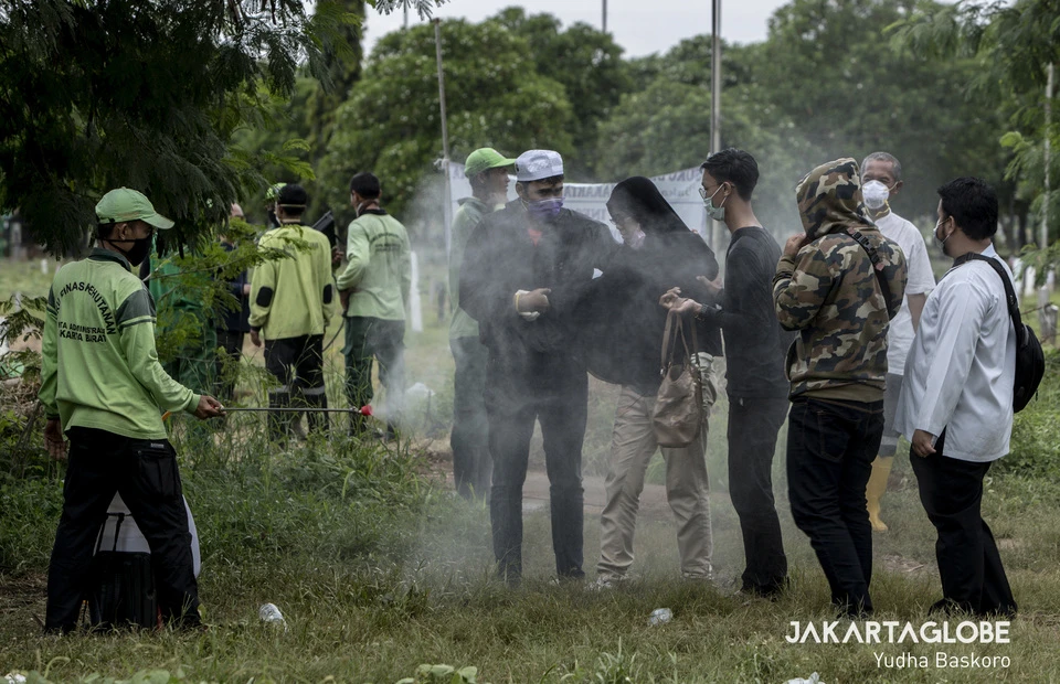 Thân nhân người quá cố được phun thuốc khử trùng trước khi rời nghĩa trang. Ảnh: JAKARTAGLOBE