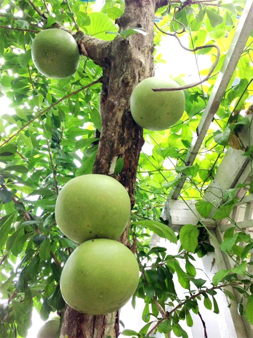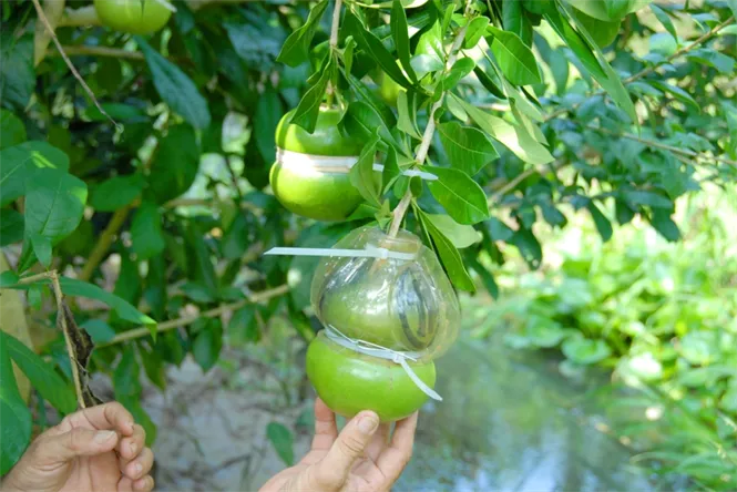 Theo vị chủ vườn, trồng bưởi hồ lô và kết hợp trồng xen với đào tiên. Đây là năm đầu tiên vườn đào tiên cho trái và được ông tạo hình hồ lô phục vụ thị trường tết....