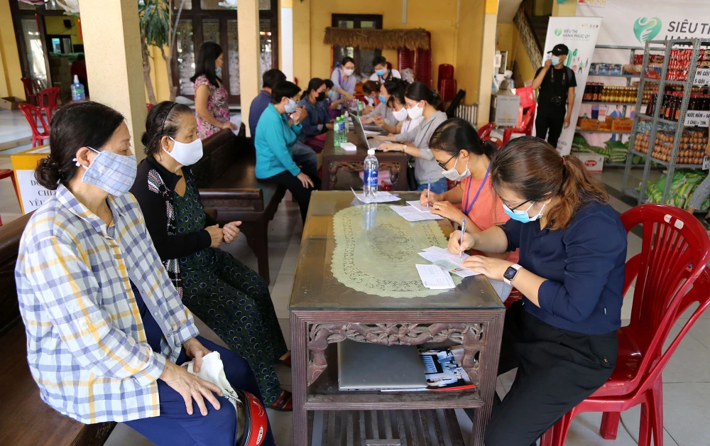 Các tình nguyện viên hướng dẫn người dân đến làm thủ tục mua hàng tại siêu thị hạnh phúc 0 đồng.