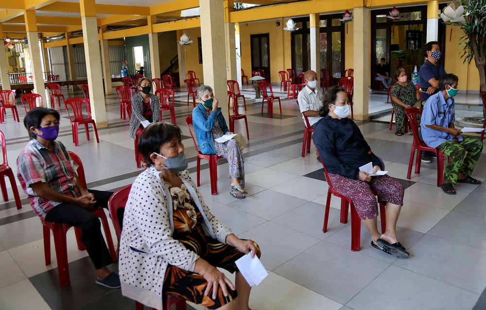 Khi đến siêu thị hạnh phúc 0 đồng, người dân được kiểm tra thân nhiệt, rửa tay sát khuẩn và ngồi vào các vị trí đã có sẵn để đảm bảo giãn cách 2 m theo quy định.
