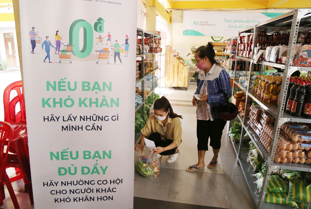 Siêu thị gồm ba gian hàng chính: Gian hàng lương thực, thực phẩm; gian hàng quần áo và gian hàng sách truyện với giá 0 đồng.