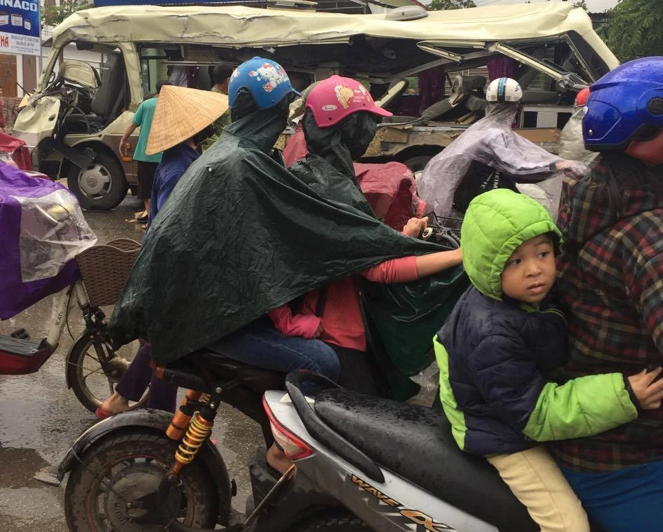 Người dân và người đi đường hiếu kỳ đội mưa đến hiện trường xem vụ tai nạn.