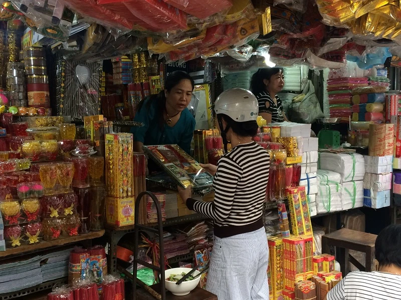 Các mặt hàng cúng lễ được trưng bày đỏ rực cả con phố, tấp nập người ra vào mua bán. Ngay từ sớm, nhiều người tranh thủ mua đồ để kịp cho lễ cúng Táo Quân.