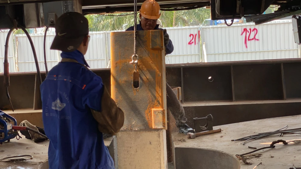 Các công nhân đang làm việc trên robot ép cọc.