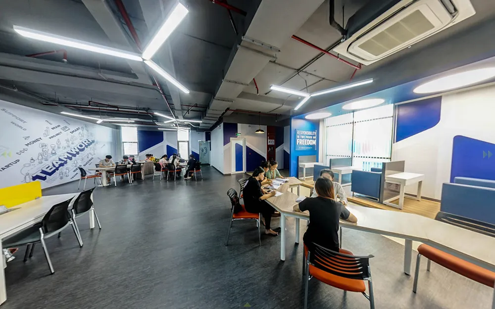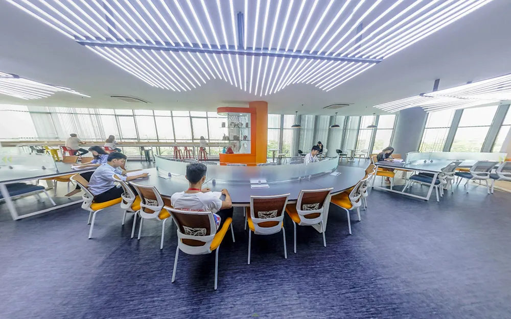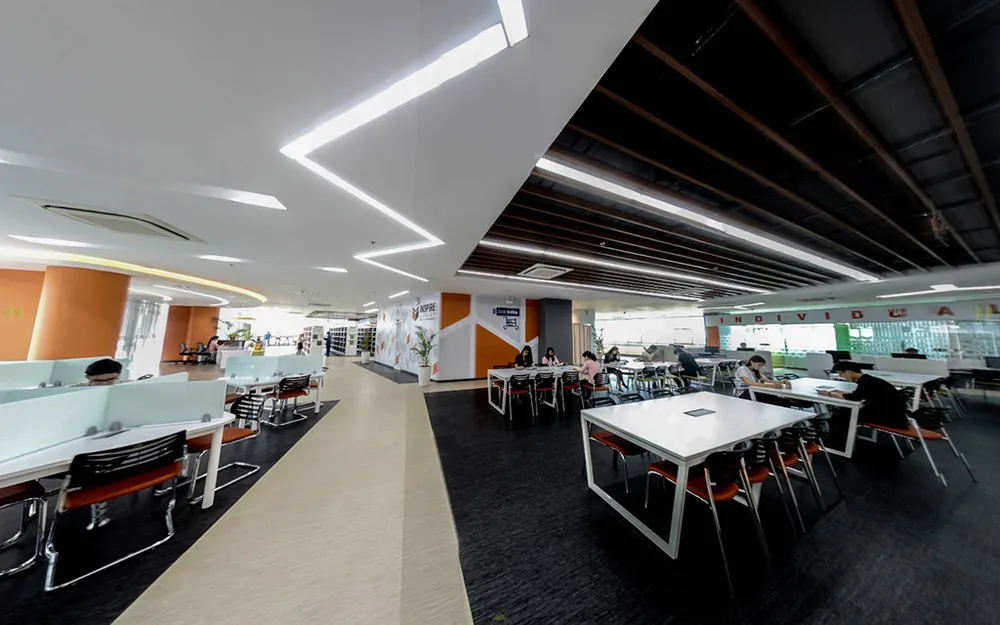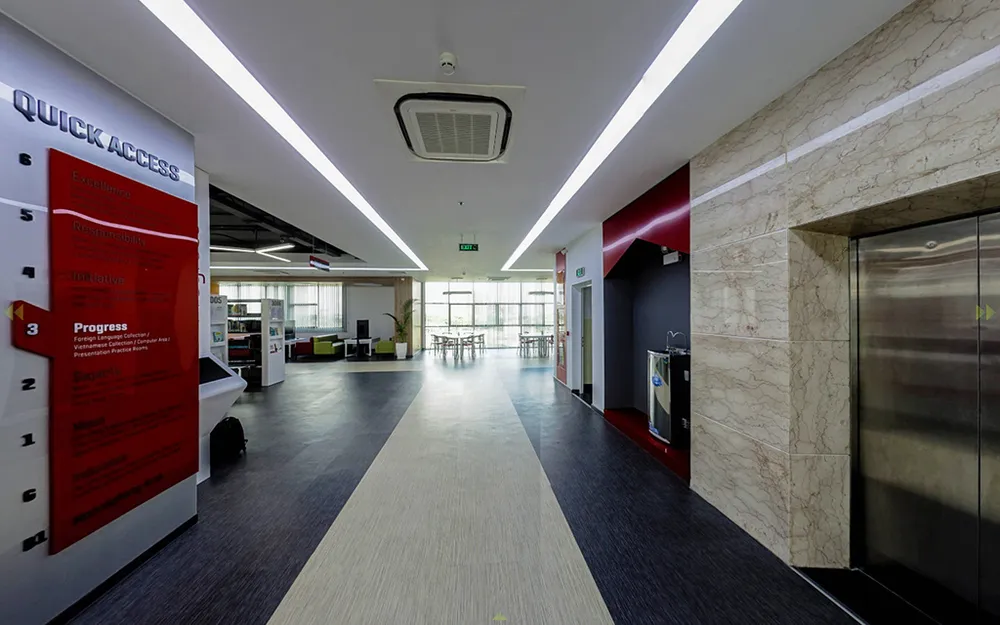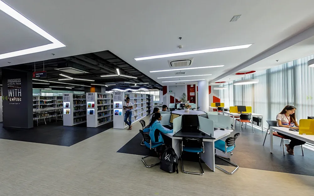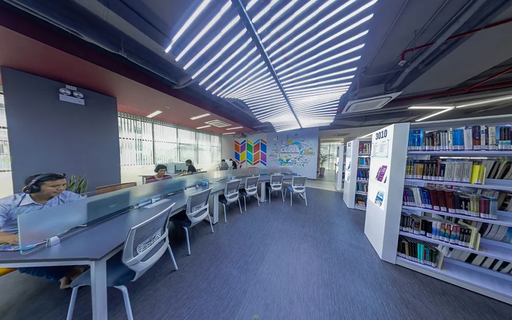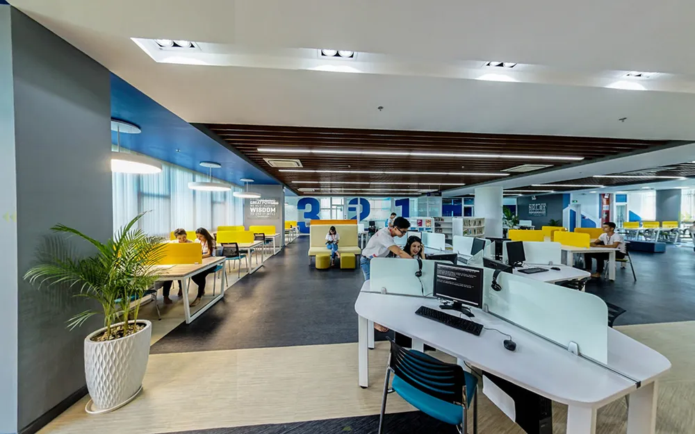 Không gian học tập chung gồm chín phòng thuyết trình, tám phòng nghiên cứu cá nhân, sáu phòng học nhóm, hai phòng xem phim, phòng hội thảo trực tuyến, không gian truyền thông sáng tạo.