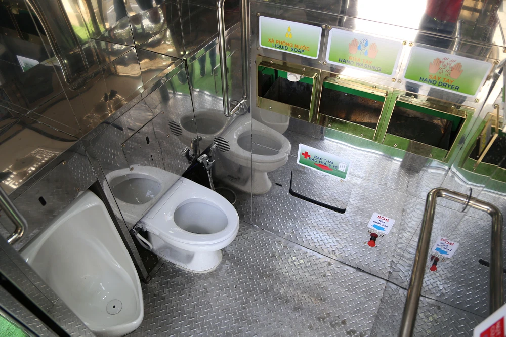 Nhà vệ sinh có cửa ra vào tự động. Có hai nút đèn xanh-đỏ, báo hiệu có người hoặc không ở bên trong nhà vệ sinh. Nút đỏ báo hiệu có người, nút xanh là trống chỗ.