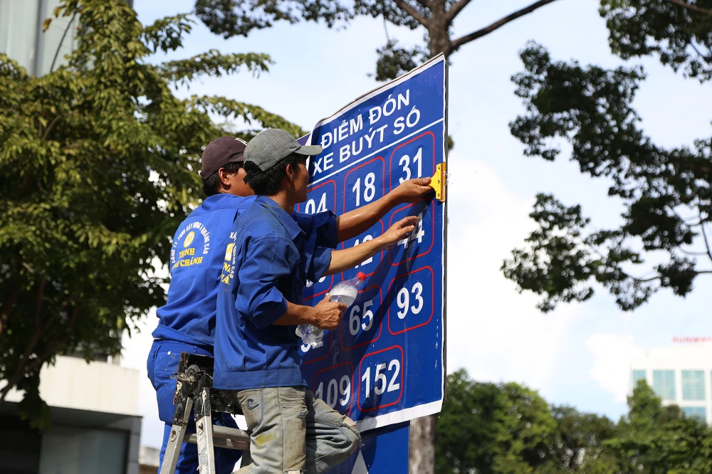 Các công nhân đang gấp rút hoàn thành các bảng thông tin xe buýt để người dân dễ theo dõi.