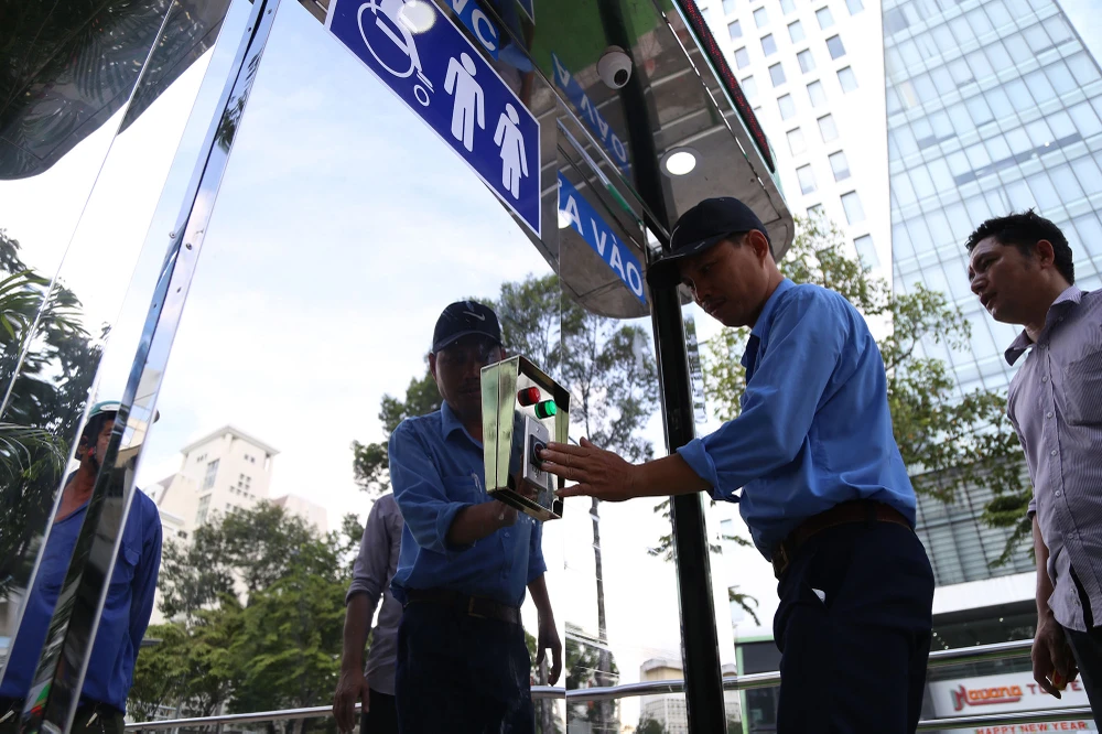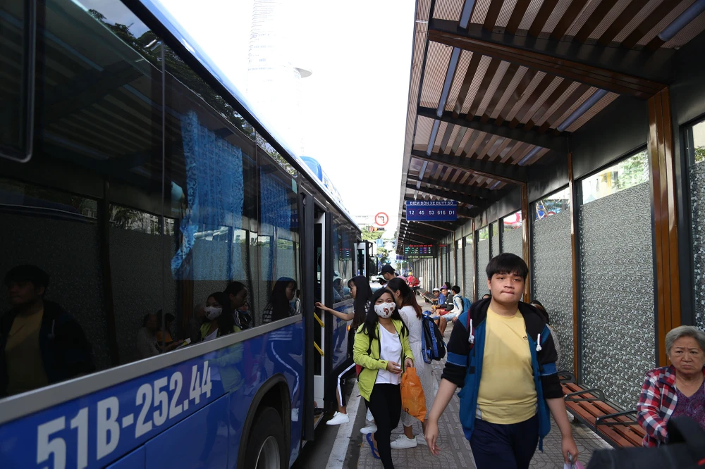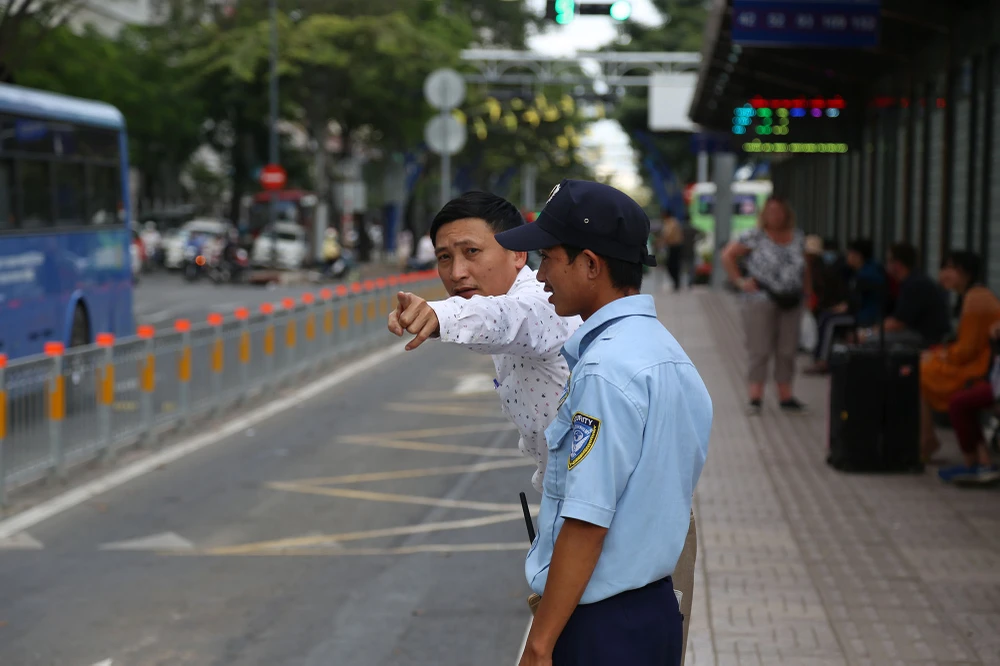 Lực lượng bảo vệ túc trực và sẵn sàng hướng dẫn hành khách đi xe buýt.