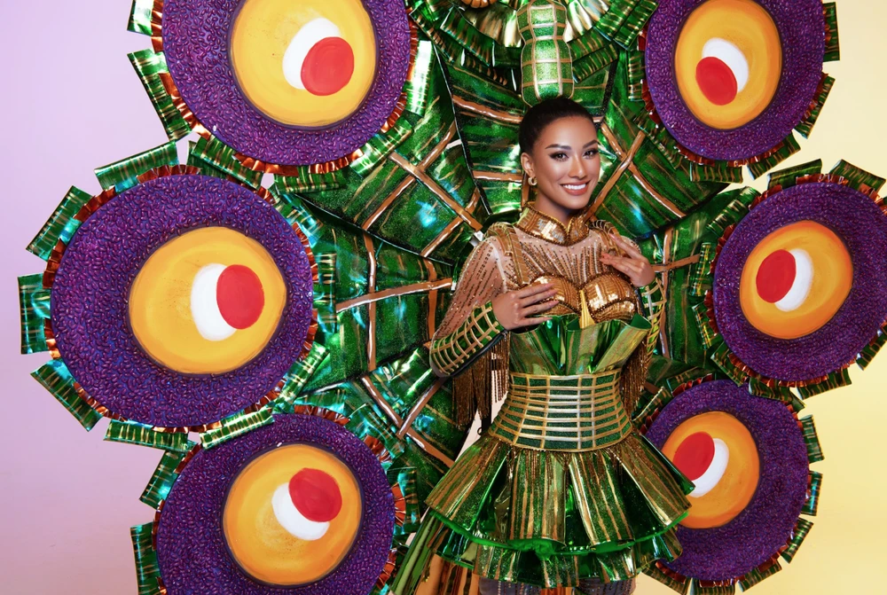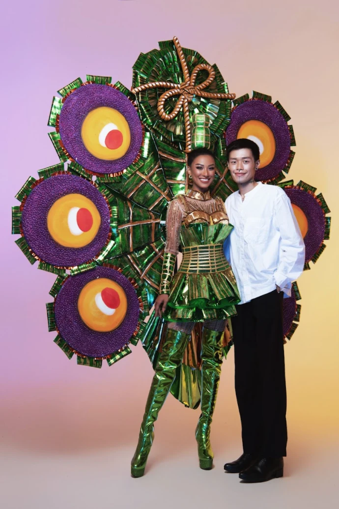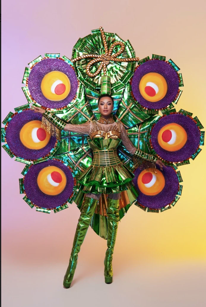 Cụ thể, lấy cảm hứng từ món bánh quê dân dã của người dân đồng bằng sông Cửu Long và cụ thể là Cần Thơ - quê hương của Kim Duyên, “bánh Tét lá cẩm” được NTK Khoa Lỗ đưa vào trang phục dân tộc cho đại diện Việt Nam tại Miss Universe 2021. Vừa chia sẻ, bộ ảnh đã thu hút sự chú ý của đông đảo người hâm mộ về sự đầu tư cầu kì, hoành tráng cùng hiệu ứng sân khấu từ trang phục mang lại.