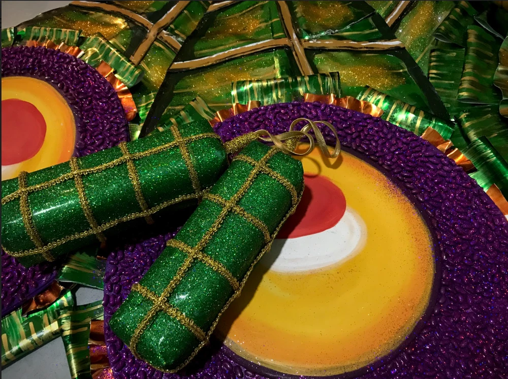 Phần khung phía sau với hình ảnh bánh tét lá cẩm vô cùng hoành tráng và màu sắc rực rỡ, bắt mắt