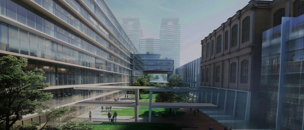 Hai tòa nhà cũ và mới được kết nối bằng khu sân vườn trung tâm với diện tích khoảng 4.000 m2. Không gian xanh ở đây sẽ làm thông thoáng cho hai tầng làm việc ngầm và kết nối với mảng xanh của Công viên Chi Lăng, Công viên Bảo tàng lịch sử, cùng với trục đường hoa Nguyễn Huệ tạo thành điểm đến của người dân.
