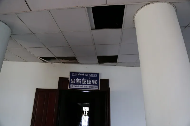 Phía trên trần của khu làm việc Bảo tàng tỉnh, các tấm phủ trần bong, nhiều người lo ngại vào mùa mưa sẽ bị dột, nước thấm từ trần xuống những bức tường phủ rêu.