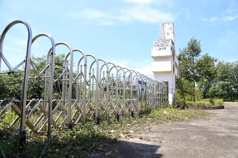 Chiếc khóa cũ rích ngoài cổng phía trước tòa nhà đã hoen rỉ do thời gian, có lẽ lâu lắm rồi không được mở, trụ và cửa sắt cũng thế. Phía trước cánh cổng này là một vùng um tùm cỏ và cây cối.
