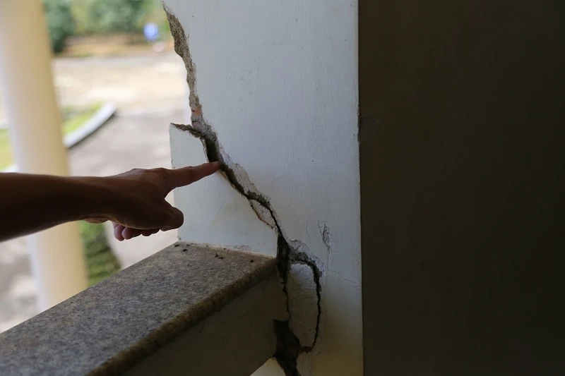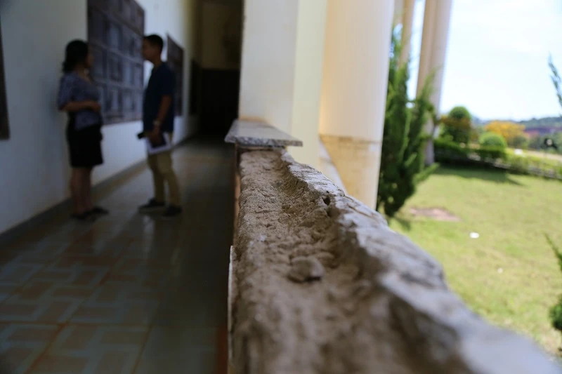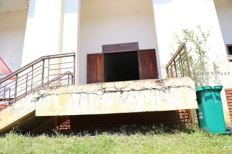 Quan sát tường, nhiều vị trí xuất hiện những vết nứt rất lớn, nhiều nơi bị bong tróc các mảng bê tông từ lâu cũng chưa được sửa chữa. Ở các bậc thềm đi vào của công trình đều có những vết nứt.