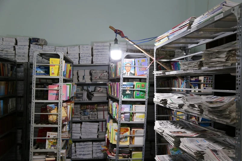 Bước vào phòng đọc sách, một nữ cán bộ làm việc ở đây nói ngay với chúng tôi rằng đây là thư viện đọc nhưng khổ lắm, điện thắp sáng cũng không có.
