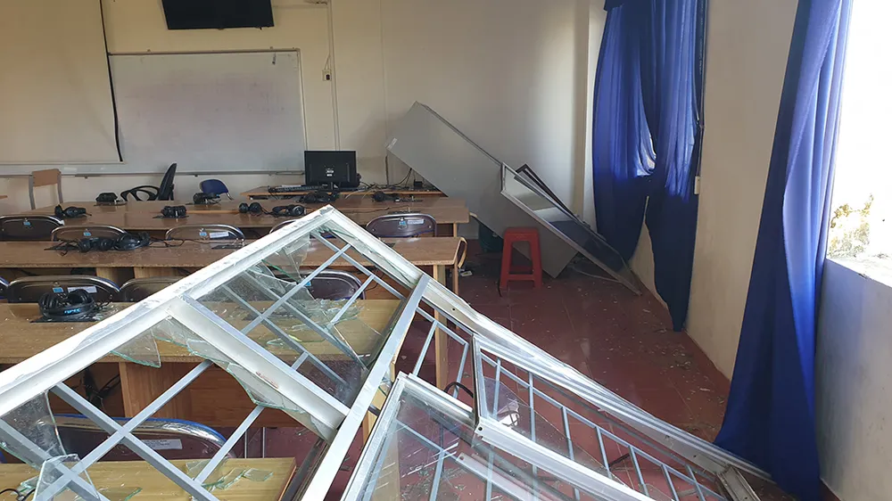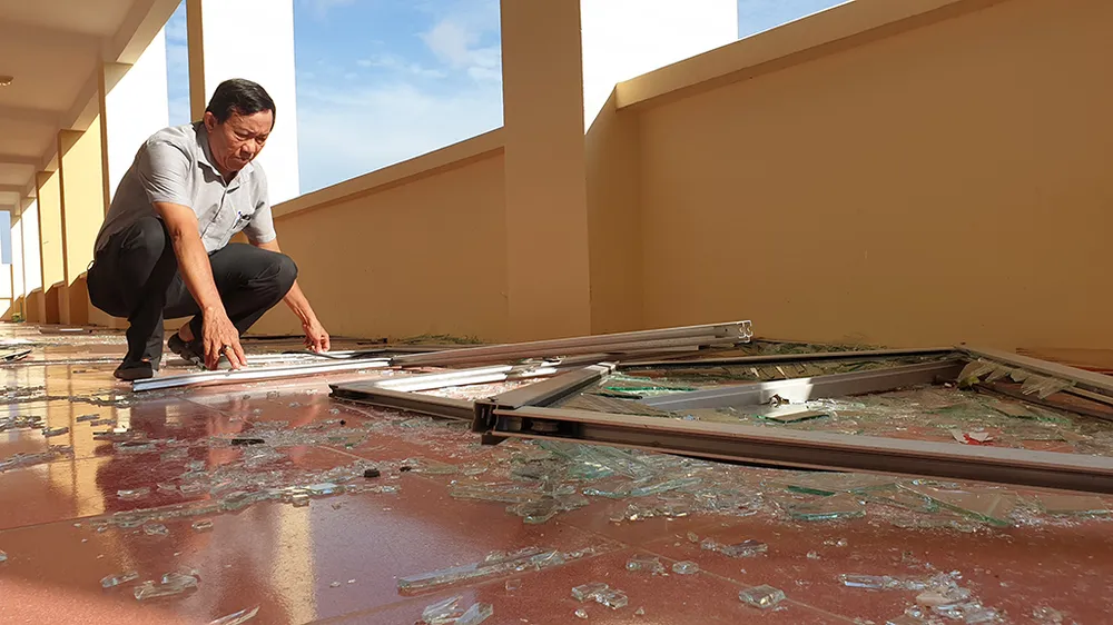 Ông Trần Đình Thám, Phó hiệu trưởng phụ trách ở trường Đại học Phạm Văn Đồng cho biết bão số 9 gây thiệt hại rất lớn đối với trường từ giảng đường, các phòng học cho đến các cơ sở vật chất bên trong đều hư hỏng. Cụ thể như hàng loạt cửa kính bị vỡ, nhiều vật dụng, máy móc phục vụ học tập bị ngấm nước, con số cuối cùng vẫn chưa được thống kê. Ảnh:Tân Toàn